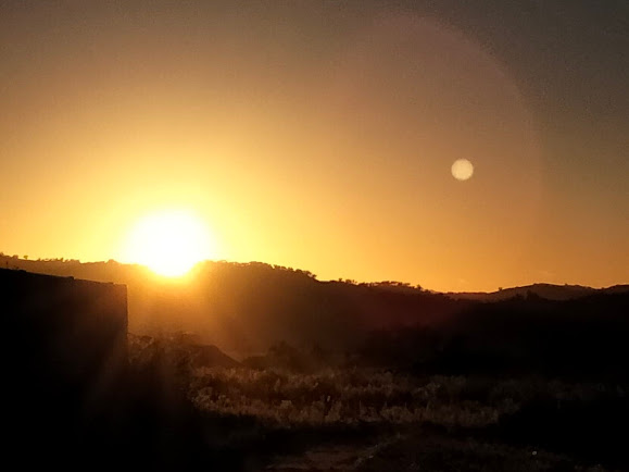 To the right, the sun was just about visible above the hills. It was quite bizarre to be walking between the two - the light of the night, and the upcoming light of the day.